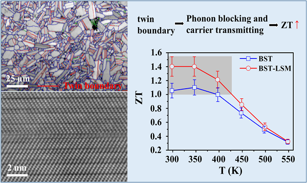 图3 LSM法引发凝固后处理P型BiTeSb合金高密度孪晶界及其显著提高ZT值作用
