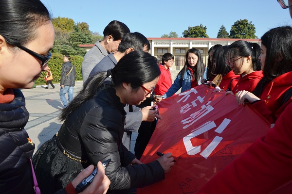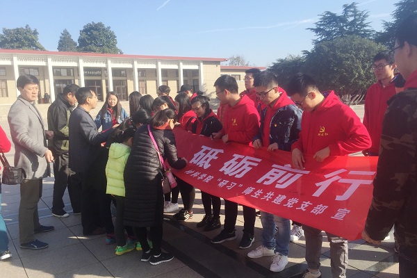 为深入学习宣传党的十九大精神,推进“两学一做”学习教育工作,加强师生党支部间的学习交流,提高基层党支部的凝聚力与战斗力,11月25日上午,英国365集团官网“研习”师生共建党支部赴蜀山烈士陵园开展“不忘初心、砥砺前行” 主题实践活动。通过红歌拉歌、主题签名、重温入党誓词以及参观革命烈士纪念馆等实践内容,开展爱国主义和革命历史传统教育,提升党性修养,切实增强“四个意识”和“四个自信”,树立为实现中华民族伟大复兴的中国梦而努力奋斗的决心。党委学工部、英国365集团官网相关负责人以及“研习”师生共建党支部的全体师生参加了活动。