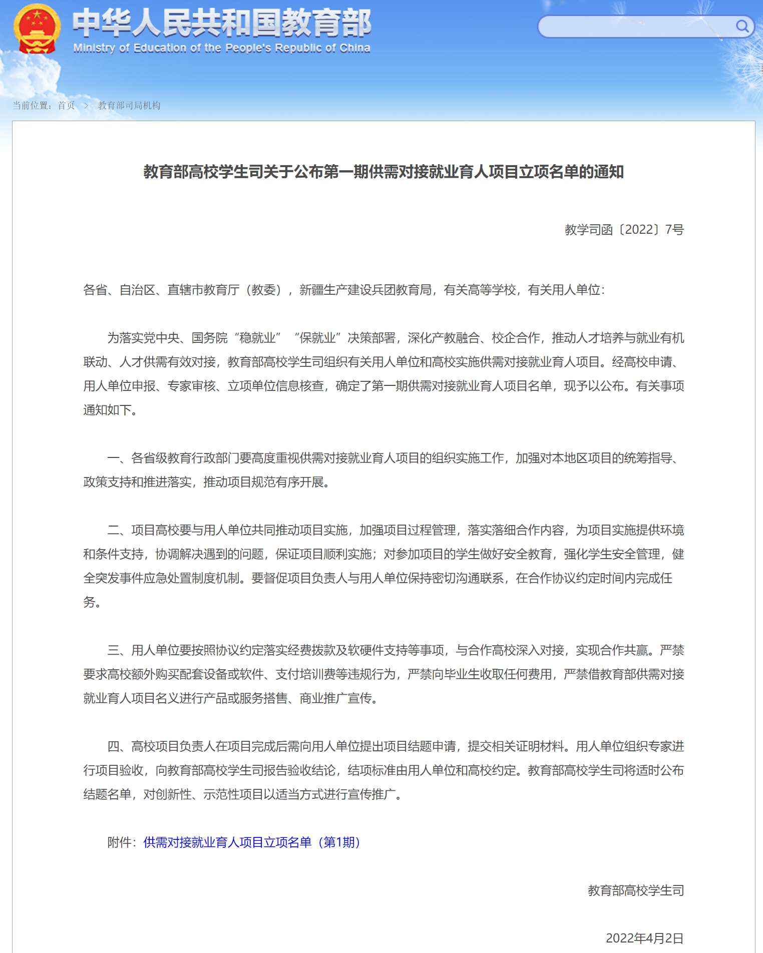近日,教育部发布《教育部高校员工司关于公布第一期供需对接就业育人项目立项名单的通知》(教学司函〔2022〕7号),公司联合海信集团控股股份有限公司共建的就业实习基地项目获批立项。