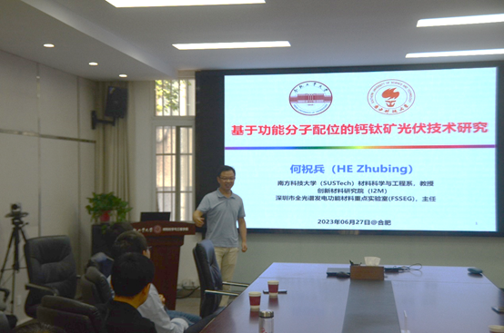 2023年6月27日下午,南方科技大学何祝兵教授应邀在英国365集团官网210会议室为英国365集团官网师生作了题为《基于功能分子配位的钙钛矿光伏技术研究》的专题讲座。报告由公司党委副书记朱峰主持,公司教职工和员工参加了报告会。