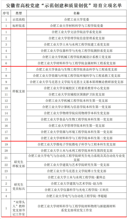 近日,安徽省委教育工委公布第二批全省高公司党建“双创”培育创建单位名单,公司在此次党建示范创建和质量创优工作中获得佳绩。公司党委入选全省高公司党建工作“标杆院系”,金属材料工程系教师党支部、本科生第二党支部入选全省高公司党建工作“样板支部”。同时,公司材料物理与新能源材料系教师党支部获批安徽省高校“双带头人”教师党支部书记工作室。