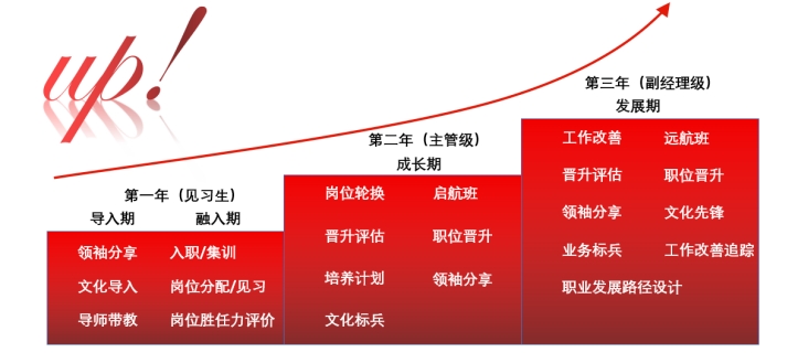 Ø 完备的培养体系:从集训-导师制-轮岗-定岗,每阶段配备导师带教,快速融入企业文化,提升职场技能;