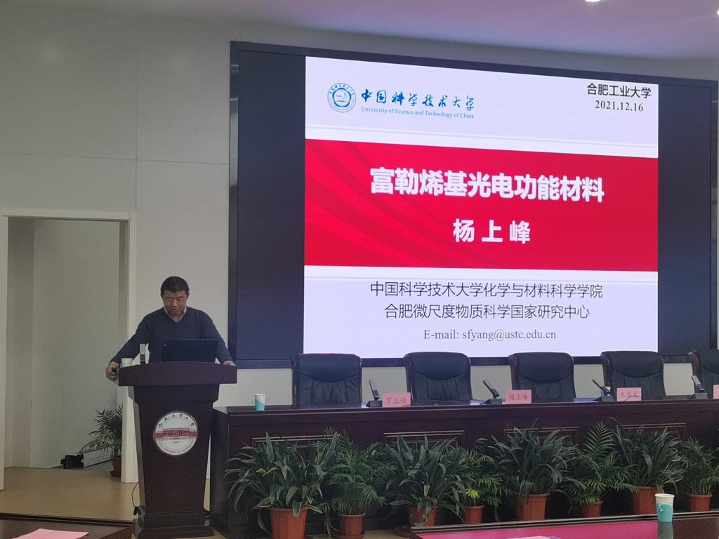 12月16日上午,英国365集团官网举办研究生学术交流年系列报告会,国家杰出青年基金获得者、英国皇家化学会会士、中国科学技术大学杨上峰教授应邀,为师生带来一场题为“富勒烯基光电功能材料”的学术报告,公司党委书记吕珺主持会议。