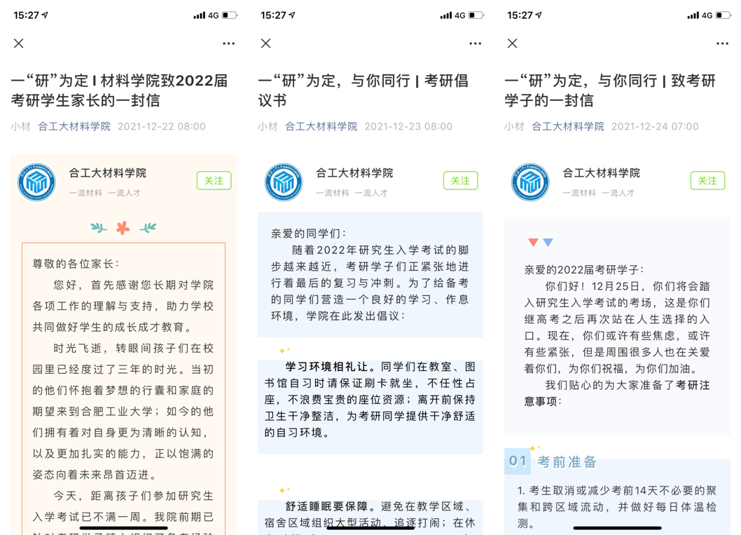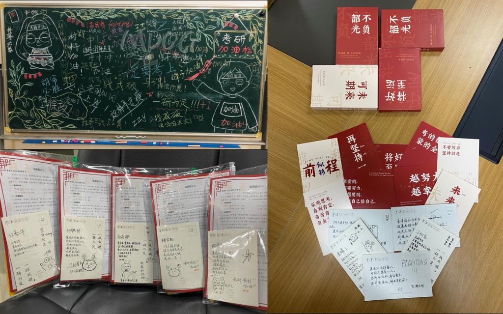 家校联动,共同护航。考研前夕,通过发布三封信“致考研员工家长的一封信”“考研倡议书”“致考研学子的一封信”,联动家庭力量、同学力量、个体力量,呵护学子备考心态、畅通学子学习场地,提醒学子考前准备、改善学子休息环境,共同为学子们考研路上保驾护航。