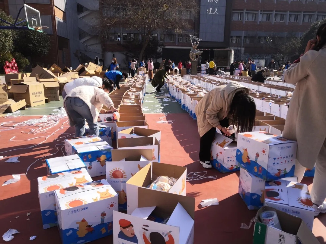 分装完毕后,经过细致的清点确认打包,志愿者按照数量将温暖包运送到货车上。货车空车而来,满载而归。车子载满温暖,继续前行,以南门小学为起点,将爱心传递到安徽各地。