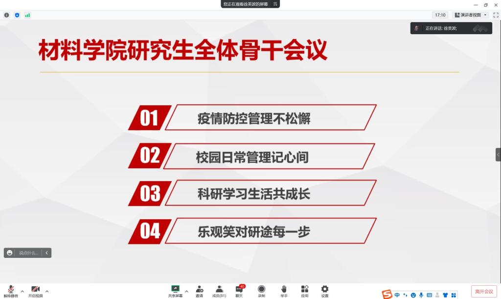 会上,研究生辅导员向同学们介绍了当前疫情防控工作形势,传达了公司疫情防控工作精神及近期疫情防控相关工作安排,强调做好疫情防控工作、维护好校园安全稳定是当前公司工作的重中之重。随后结合实际工作,对与会同学提出具体工作要求。希望全体骨干一要进一步提高站位,充分认识疫情的严峻性和复杂性,克服麻痹心理与松劲心态,以高度的责任感和使命感完成各项工作;二要积极发挥带头作用,勇于担当,配合公司及公司做好疫情防控各项工作,深化班级日常管理,进一步落实网格化管理工作实效,督促班级同学做好个人安全防护,严格执行健康打卡和每日核酸检测,切实增强科学防控意识,积极构筑校园疫情防控安全屏障;三要充分发挥桥梁纽带作用,主动关心问询同学们当前在科研、学习以及生活中存在的困难,及时向公司反馈,做好同学们与公司之间的信息传递。