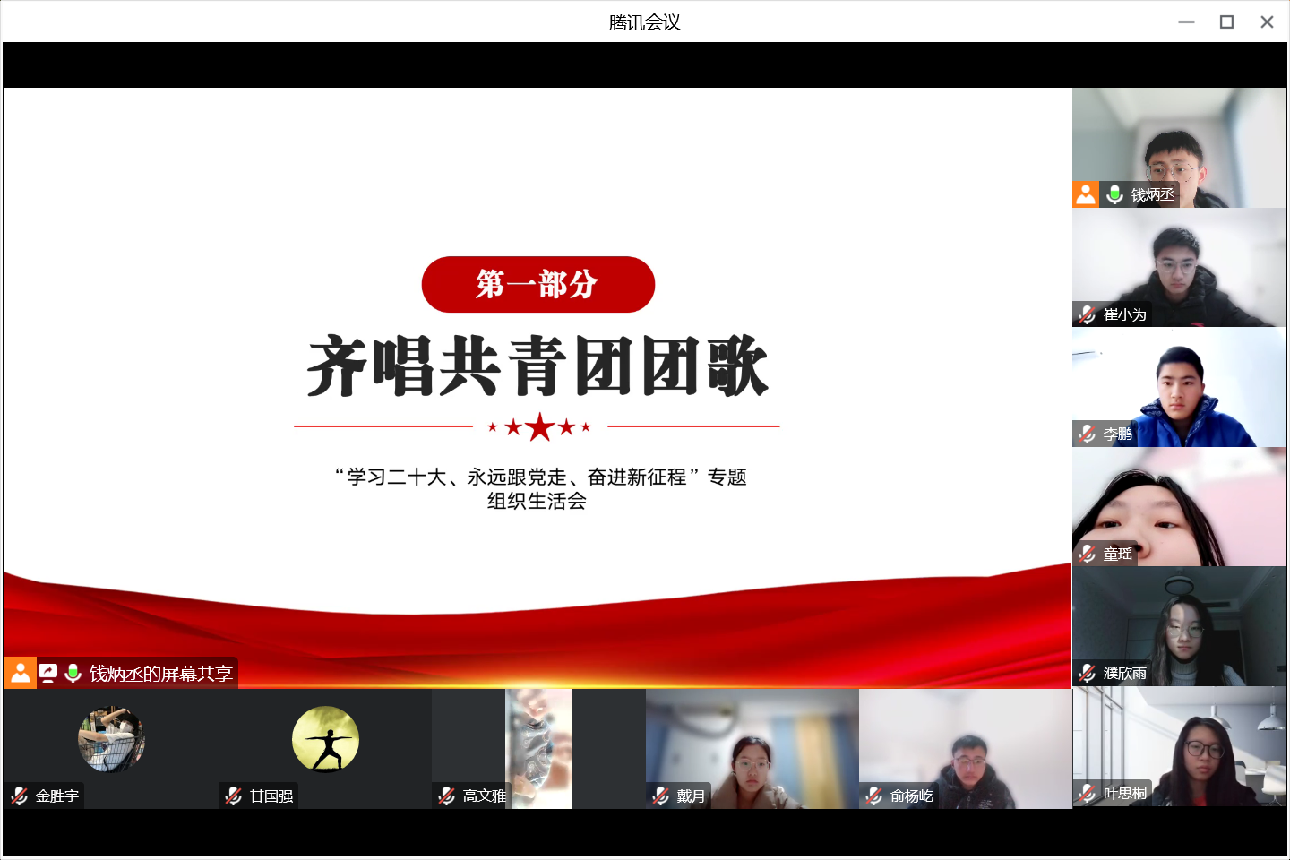 会议中,团员齐唱共青团团歌。团支部书记汇报了团支部本年度关于“学习二十大、永远跟党走、奋进新征程”主题教育实践活动的开展情况,并结合团支部工作和个人实际情况交流心得体会。随后,结合个人学习体会,团支部委员、其他团员依次发言分析个人在思想道德和学习工作中的不足及努力方向,表示将在接下来的老员工活中脚踏实地学好专业知识,提高工作水平,时刻保持学习工作中的积极性,奋发进取,奉献青春力量。根据全体团员日常表现及发言表态,团支部线上开展民主测评投票,由班主任针对本次组织生活会展开点评,提出发展建议。最后,在团支部书记的带领下,全体与会团员重温入团誓词,回顾入团初心。