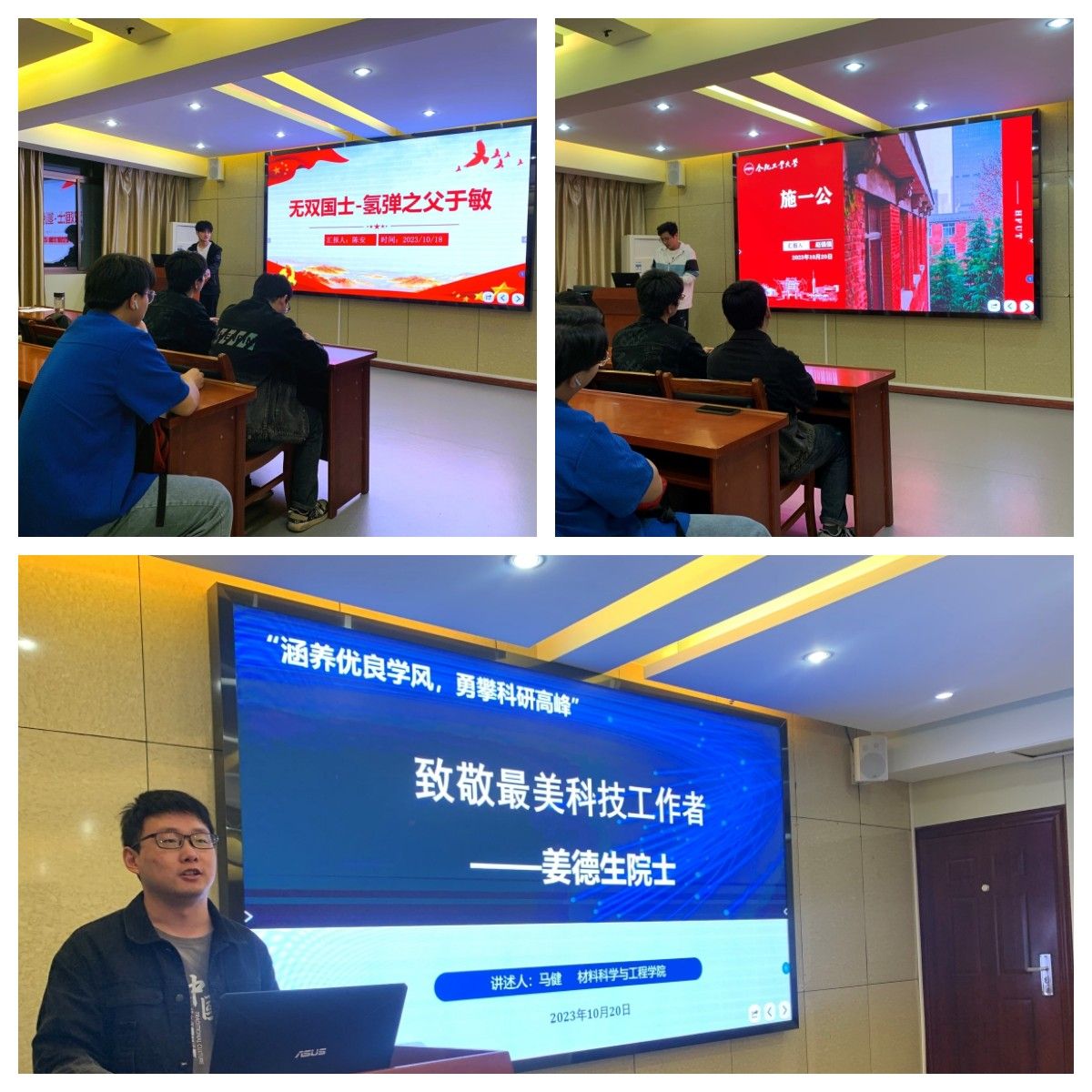 会上,三位同学分别介绍三位科技工作者的事迹以及背后蕴含的科学家精神,通过互动交流,学习和继承协同合作和追求真理的科学家精神。陈安同学讲述了氢弹之父于敏老先生的事迹。于敏老先生28载隐姓埋名,艰辛研制氢弹,填补了中国原子核理论的空白,为氢弹突破做出卓越贡献,荣获了“两弹一星”功勋奖章,国家最高科学技术奖等崇高荣誉。于敏老先生打破国外重重封锁,依靠自己勤奋努力举一反三进行理论探索的科学家精神值得我们学习。赵强强同学介绍了施一公先生。施一公先生是中国科公司院士、美国国家科公司外籍院士、欧洲分子生物学学会外籍会士、现任西湖大学董事长。在美国生活了十八年的施一公面对广阔的事业发展前景,优越的生活条件毅然决定回国,回到母校清华为中国科技和教育体制的进一步发展付出更多。马健同学介绍了姜德生院士。姜德生院士是武汉理工大学首席教授,光纤传感材料与传感技术专家。在新世纪初光纤光栅材料核心部件技术掌握在外国手中的背景下,打破中国国外技术封锁,形成了具有中国自主知识产权的成套生产技术与设备,为中国众多行业与重大工程及军工提供了急需的新一代传感技术。
