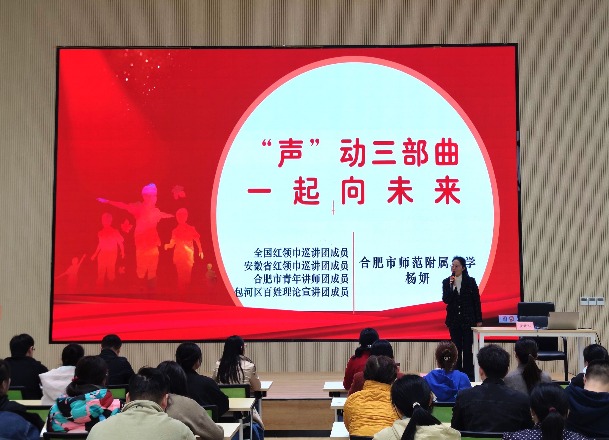 共建仪式结束后,与会全体成员参加了“青年宣讲进基层”活动。活动中,安徽省少工委副主任、全国红领巾巡讲团、合肥市青年宣讲团成员、合肥市师范附属小学教师杨妍和全国少先队名师工作室负责人、安徽省少工委委员、合肥市万慈小学党支部书记、董事长王玲玲分别以“‘声’动三部曲,一起向未来”和“青春强国,挺膺担当”为主题,带领全体成员深入学习了习近平新时代中国特色社会主义思想的核心要义,重点围绕“两个结合”“六个必须坚持”“十个明确”“十四个坚持”“十三个方面成就”等开展了学习研讨,不断增进对党的创新理论的政治认同、思想认同、理论认同、情感认同,引导广大青年将个人理想融入到国家理想、社会发展中去,为社会主义现代化强国建设贡献自己的青春力量。