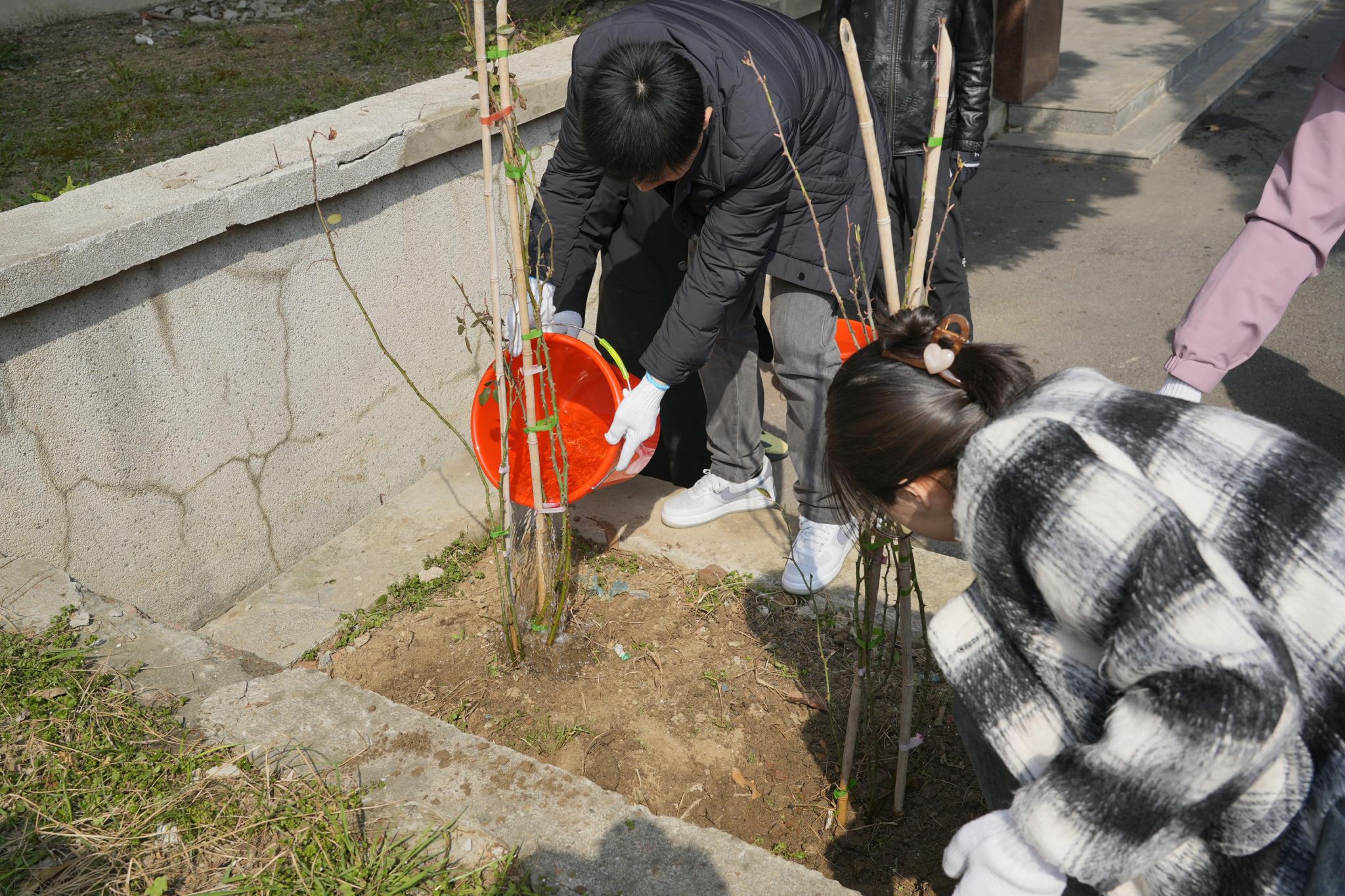 上午,在材料楼前的植树现场,英国365集团官网机关党支部和本科生第二党支部师生热情饱满,齐心合力,干劲十足。师生一起挥锹铲土、栽种花苗、培土浇水,每道工序都一丝不苟,现场有条不紊的劳动场景成为材料楼前一道美丽的风景线。一番井然有序的忙碌后,一棵棵新栽种的月季花苗亭亭玉立。