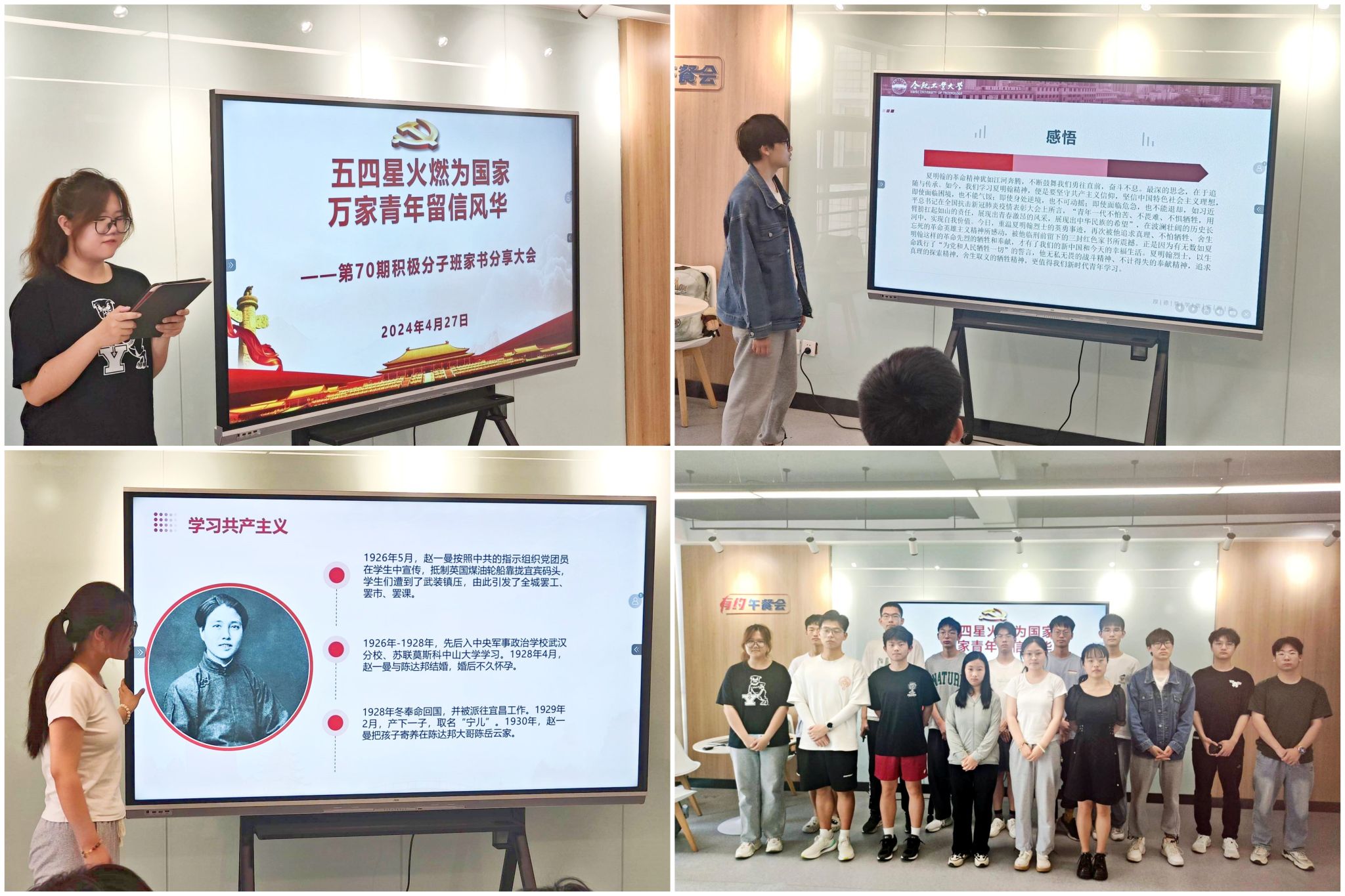分享会上,同学们通过诵读家书原文,配合真实图像、影视资料等,学习了闻一多、聂荣臻等五四时期革命志士写下的家书,了解了那个时代的先辈们赴汤蹈火的信念和柔情似水的亲情。通过此次分享会对五四时期革命志士精神的学习,同学们纷纷发表了各自感悟,积极分子大家表示五四时期虽然时局动荡但仍有一群甘愿为中国未来而奉献青春的青年值得新时代青年学习与传承。无机非 23-1 班黄春梅同学说:“在家书诵读活动中我收获了许多,以家书为镜,照见了初心,学习到了先辈的革命精神和奋斗精神。在家书中,聆听他们的心声,感受他们的情怀,继承他们的遗志。”材料成型 23-1 班任泽楷裕同学说:“我们这代人从小到大就一直说着要学习先辈们的革命精神和奋斗精神,可什么是这些精神的内涵?我们并不得知,直到这次活动我们通过这一封封五四运动时期的家书,才知道了他们波澜壮阔的一生和他们一往无前的革命精神,我们定会深刻体会这份精神并加以传承。”
