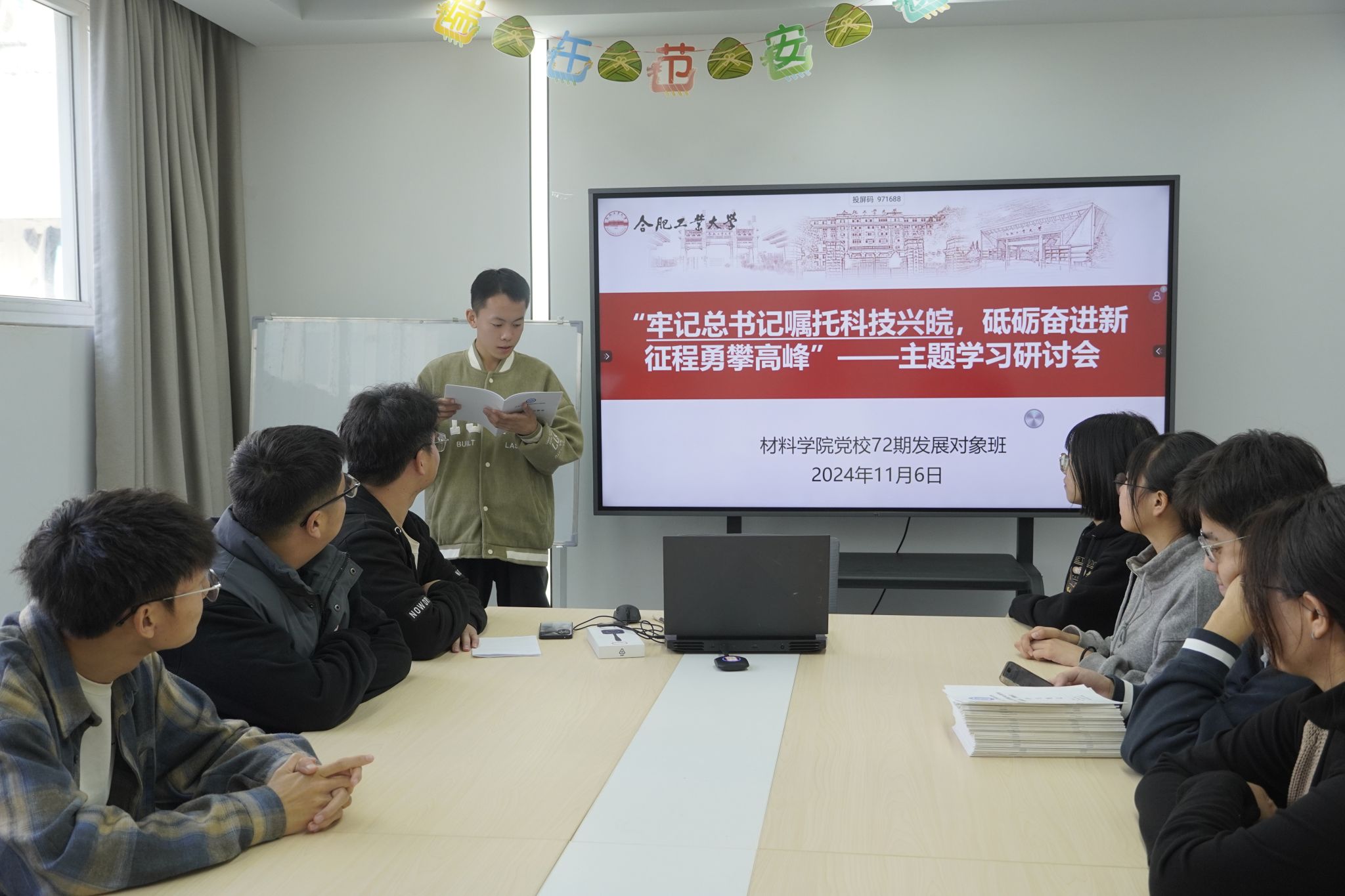 本次学习研讨会分为理论学习、视频观看和讨论发言等三个环节。全体学员集中学习观看了习近平总书记第三次赴安徽考察调研相关视频,认真学习了习近平总书记三次视察安徽重要讲话精神。学员们结合自身成长经历、工作、学习和生活等情况进行讨论交流并分享了自己的学习体会,发展对象班学员汪学思表示:“我们要将习近平总书记的嘱托牢记于心,将其融入到我们专业学习中,勇于创新,敢于突破,以实际行动为安徽的发展贡献力量。”