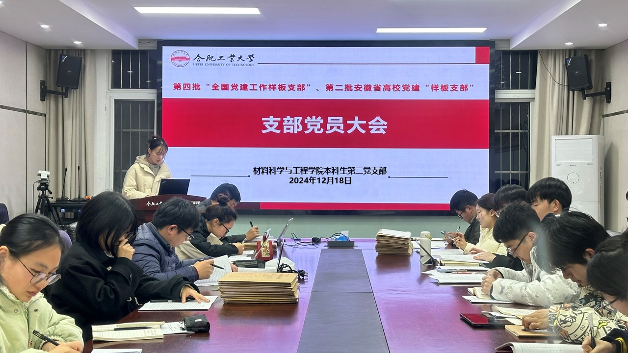 12月18日,全国“样板支部”、​英国365集团官网本科生第二党支部在屯溪路校区小红楼210召开了2024年下半年预备党员转正支部大会暨“材料强国”(第一期)专题政治理论学习。大会由党支部副书记程振洋主持,支部全体党员30余人参会。