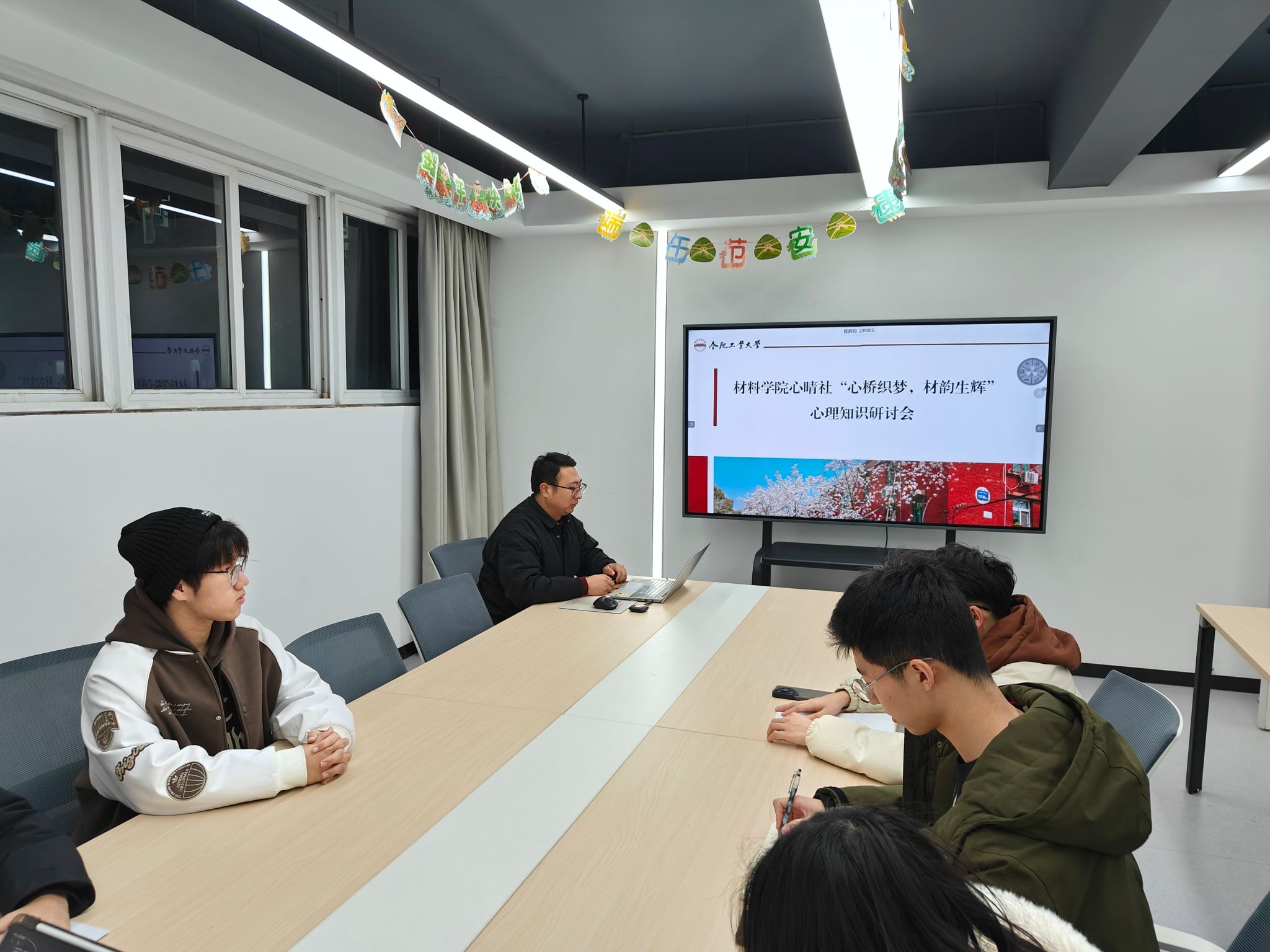 为深入学习心理学知识,12月31日晚,​英国365集团官网心晴社老员工心理工作室于翡翠湖校区四号宿舍楼员工社区会议室开展了主题为“心桥织梦,材韵生辉”心理知识研讨会,​英国365集团官网心晴社的6位同学和公司辅导员参与了本次活动。