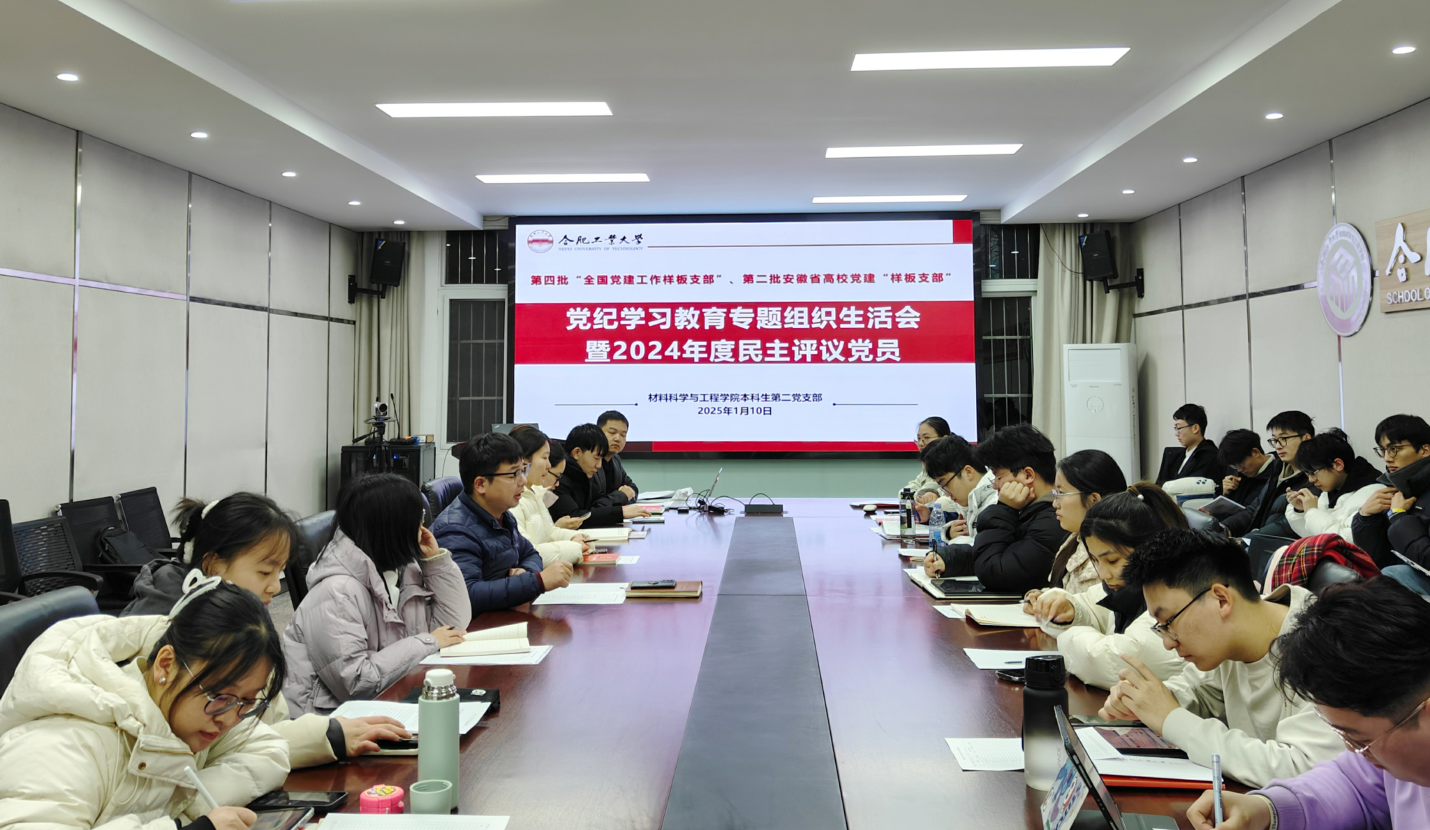 1月10日晚,全国“样板支部”、英国365集团官网本科生第二党支部在屯溪路校区小红楼210召开了党纪学习教育专题组织生活会暨2024年度民主评议党员。会议由党支部书记马贤峰主持,党支部全体党员30余人参会。