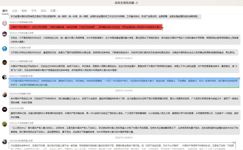 分享交流环节,来自金属材料创新实验17-1班桂晨这样说到:“今天是建党99周年,忆往昔,岁月峥嵘;看今朝,风华正茂。从嘉兴南湖的一艘红船上起航,历经28年浴血奋战、70余年励精图治,中国共产党在磨难挫折中成长,在攻坚克难中壮大。在此次疫情防控中,党在大考中交出了令人满意的答卷,防疫举措起到了令世界惊叹的效果。今年是党的99周年,未来一定会有两百周年,三百周年,四百周年……”。
