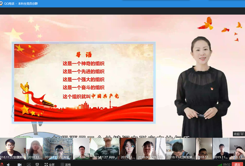 7月1日下午,为庆祝建党99周年,英国365集团官网在本科生党员总群通过QQ群“云”平台开展了题为“在战‘疫’中读懂中国共产党”的线上视频微党课主题学习教育活动,公司党委副书记、副经理杨玲老师担任主讲老师,50余名员工党员在线参加。
