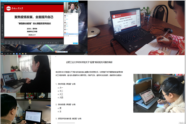 调研把脉,心理疏导,呵护象牙塔外的身心健康。疫情当前,公司各年级辅导员积极向校外的老员工们宣传贯彻疫情防控工作的官方文件精神和工作措施,转发权威消息,传播科学防控知识,积极开展“我为武汉加油”线上防疫知识宣传,召开“疫情无情、人有情”主题班会,积极为防疫发声。同时,公司辅导员们群策群力,积极制定《关于疫情期间的相关问题调研》问卷,对全院员工开展调研,了解同学们的心理状况,针对员工在疫情防控期间心理调适、情绪管理、谣言应对、线上学习、居家生活中可能产生的各种心理状况,传授疫情防控心理自助与疏导的知识,组织同学们在线学习“防疫健康教育知识课”,开展疫情防控专题心理健康辅导,帮助员工培育理性平和的心态,提高情绪调控能力,提升破解网络谣言的能力,及时向员工传递关心和关爱,呵护同学们的身心健康。