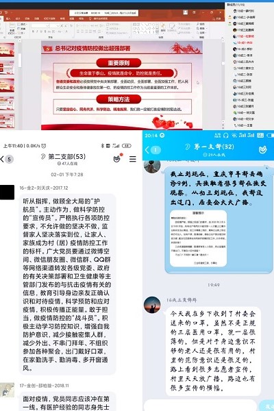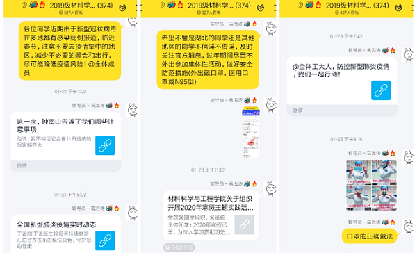 言传身教,知行合一,做好非常时期的思想引领。自新型冠状病毒感染的肺炎疫情发生以来,公司辅导员们充分调动党支部、团支部的力量,利用学习强国、网上直播、QQ直播、QQ群等平台,及时传达习近平总书记对当前新型冠状病毒感染肺炎防控工作作出的一系列重要指示精神,以及教育部、安徽省和公司关于疫情防控的政策以及工作要求,积极关注疫情防控进展,保证了学习不断线,进一步增强了疫情期间党团组织的思想引领作用。部分青年积极响应号召,充分发挥“一个支部就是一个堡垒,一名党员就是一面旗帜”的战斗堡垒和先锋模范作用,积极投身志愿服务,冲锋在疫情防控第一线,让党旗、团旗在防控疫情斗争第一线高高飘扬!材料物理2018-1班员工党员周霆宇、材料成型及控制工程17-1班员工党员杜黎明、材料类19-6班团员贺景浩、材料类19-4班钱璟,积极参与到社区防疫工作中;2019级材料类专业积极组织线上零星捐款,其中材料类19-3班何展辉个人捐款1100元。志愿者们均表示危难当头,愿意贡献自己的绵薄之力,同祖国共渡难关。