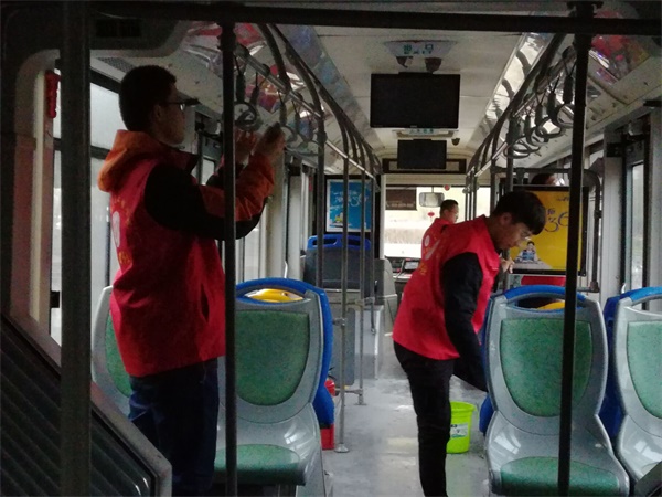 活动当天,在淅淅沥沥的小雨中志愿者们在部门部长的带领下来到了公交车站,与车站的工作人员进行了简单的沟通和交流。随后,在工作人员的指导下,志愿者们分工合作、互帮互助,他们左手抹布,右手水桶,干的热火朝天。对226公交总站服务基地及停放在场区内的所有公交车进行全面清扫,从地面到座位,从车窗到扶手,每一个角落大家都认真打扫,他们用自己的实际行动展现了当代老员工的青春风采。