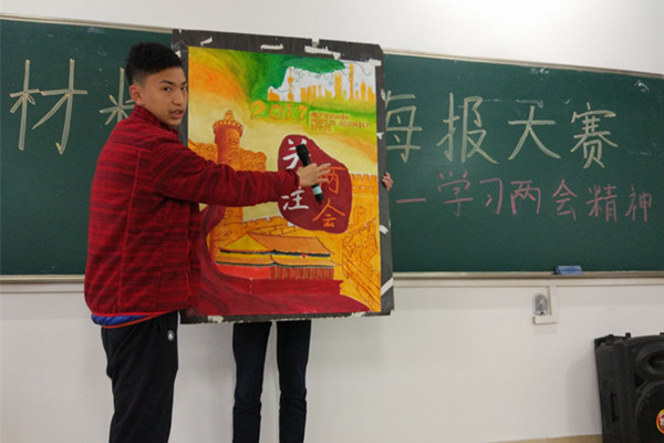 该院2016级各班团支部在查阅、学习两会相关资料的基础上,将自己心中的“两会蓝图”描绘成一幅幅生动的海报。活动现场,各班代表用精彩的语言,从海报的构思和绘制过程入手,讲解了自己对两会热点时事的认识与看法。各班的海报都立意鲜明,题材新颖,色彩绚丽,大家用自己的画笔表达了当代老员工对国家政治事件关心以及时政问题的看法和独到的见解。经打分评比,材料物理2016-1班荣获一等奖,金属材料工程16-2班和材料成型及控制工程16-3班荣获二等奖,粉体材料科学与工程16-1班、金属材料工程16-1班和无机非金属材料工程荣获三等奖。