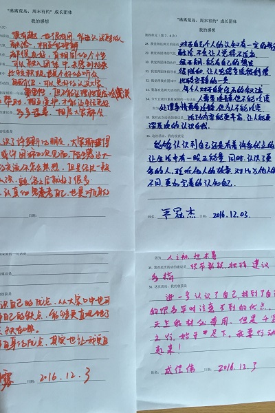 在活动之后,每一位参与的同学都会认真填写记录卡,写下自己的收获,同学们纷纷肯定了活动的意义以及活动对自己的帮助。13级员工徐嘉俊说:”刚开始的时候很紧张,但是之后随着心情的放松逐渐敞开心扉,越来越想表达自己。”13级员工成佳伟同学说到:“活动很有意义,让自己思考了很多,进一步认识了自己,找到了自己的很多平时注意不到的优点,但是千里之行始于足下,我要行动起来。”14级员工任新宇说:“通过这些活动,让我发现了自己身上的闪光点,也许不只游戏能给我们带来自信。”14级员工周鹏说到:“要多与身边的人交流,不能封闭自我的世界,朋友是人生中不可或缺的一部分。”