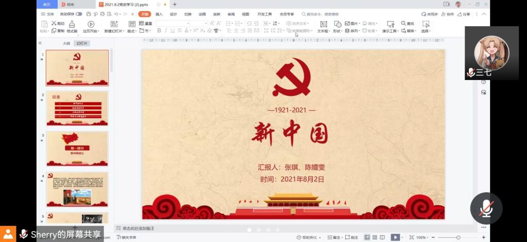 8月2日下午,英国365集团官网本科生第三党支部于线上集中开展学习中华人民共和国的成立和社会主义制度的建立党史主题党日活动。主题活动由陈嬗雯和张琪两位党支部新发展党员主持并进行党史授课,第三党支部全体成员(含预备党员)参加活动。