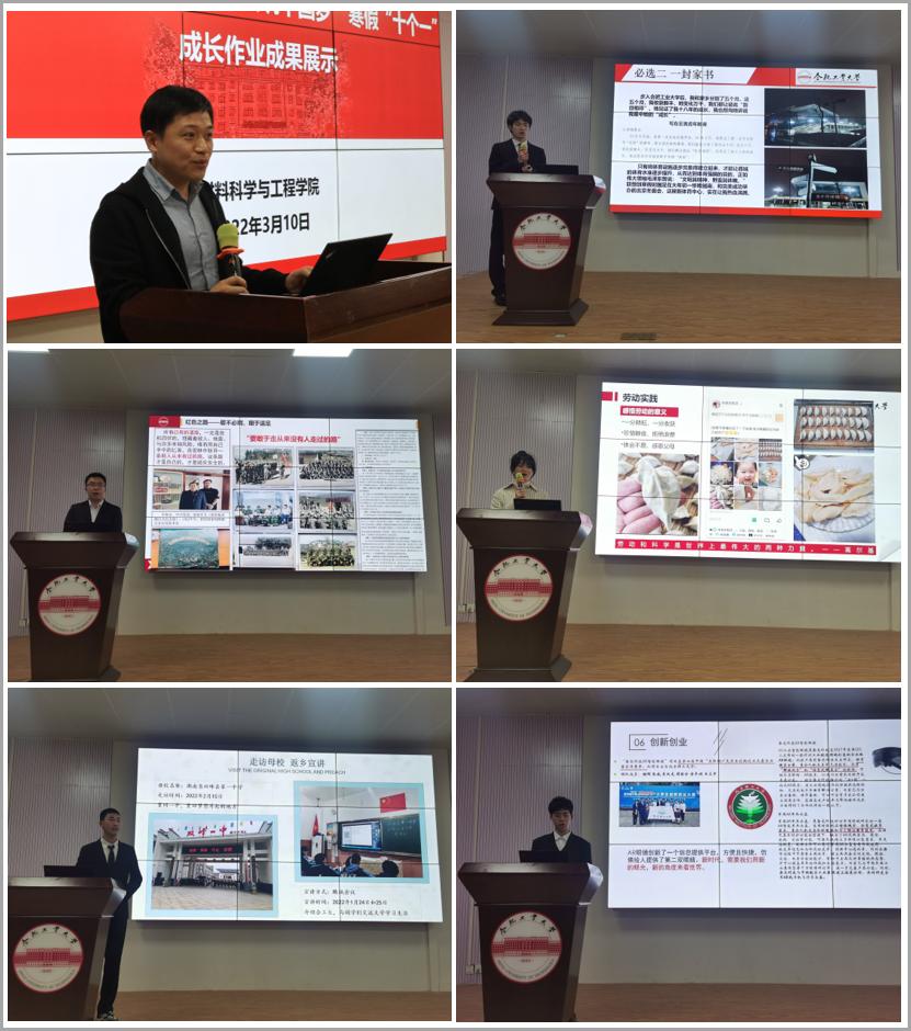 开学初,公司以班级为单位开展了寒假“十个一”成长作业主题分享会,有人实地走访党员,见证初心故事;有人书写家书,激发家国情怀;有人宣讲工大故事,奉献青春锻造自我。经团支部推荐共有25位同学参与了公司汇报展示。材料类21-3班的周泽宇同学以“成长之行,报国之心”为主题,从返乡造访高中、寻访党员、学习雷锋精神、撰写家书等方面展示了他的寒假作业成果;21-7班的贺乐平同学则以“我与伟人,同走来时路”为主题,讲述了走访毛泽东主席故居的经历;21-6班的黄彦涛同学以“奋斗因使命,实践映初心”为主题,讲述了寒假期间完成的八项作业。