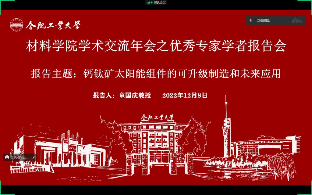 为了提高研究生学术素养,开拓学术视野,提高员工的学习兴趣,英国365集团官网邀请了英国365集团官网黄山学者优秀青年人才计划主持人童国庆教授于12月8日在材料楼6楼601会议室做关于钙钛矿太阳能组件的可升级制造和未来应用报告会。