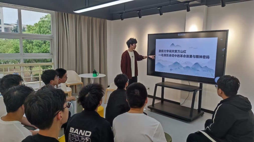 分享会上,读书小组组长崔瀚文以毛泽东《沁园春·长沙》中的“万山红遍,层林尽染”为切入点,阐述了毛泽东诗词中“革命浪漫主义”的独特魅力。他指出,毛泽东将革命理想与自然意象深度融合,如“红旗卷起农奴戟”(《七律·到韶山》)中,用“红旗”象征革命力量,以“农奴戟”展现人民觉醒,这种艺术表达既具历史厚重感,又充满诗意张力。组员奴尔特力克从“时空跨越”视角解读毛泽东诗词。他以《七律·长征》为例,分析“五岭逶迤腾细浪,乌蒙磅礴走泥丸”如何将红军长征的艰险转化为“细浪”“泥丸”的意象,体现了革命者“藐视困难”的豪迈气概;组员汪冠群以“斗争精神”为线索,结合《满江红·和郭沫若同志》中“四海翻腾云水怒,五洲震荡风雷激”的诗句,阐释了毛泽东诗词中“敢于斗争、善于斗争”的哲学内涵。