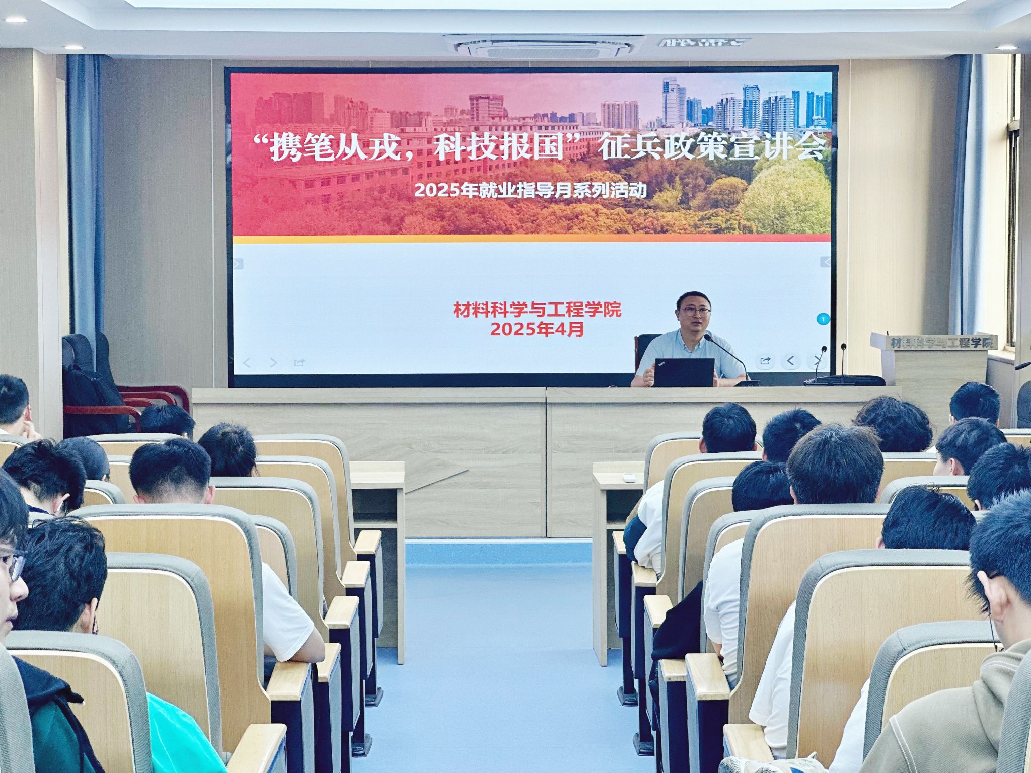 为积极响应国家征兵号召,鼓励青年学子投身军营、报效祖国,做好2026届毕业生征兵宣传工作,4月18日下午,英国365集团官网于材料楼601举办“携笔从戎,科技报国”征兵政策宣讲会。公司70余名员工参与活动。