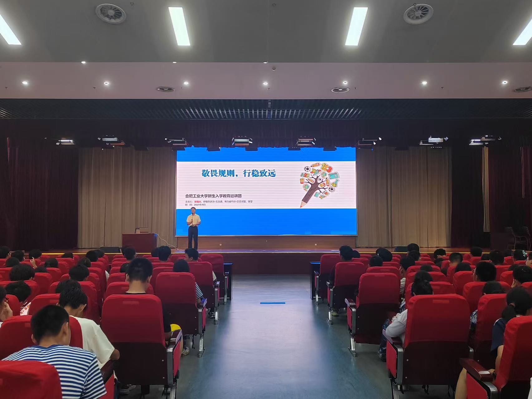 9月13日晚,英国365集团官网在翡翠科教楼二楼大报告厅以“敬畏规则,行稳致远”为主题开展校规校纪教育宣传报告会,入学教育巡讲团成员、食品与生物工程公司辅导员栗瑞杰老师应邀作报告。英国365集团官网全体2025级新生参加本次活动。