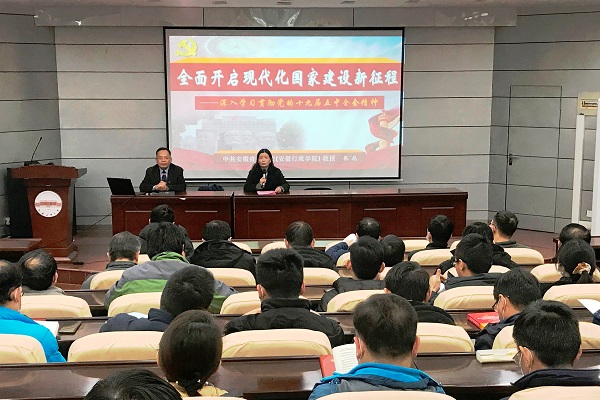为进一步增强教职工的政治定力,切实将思想和行动统一到党的十九届五中全会精神上来,12月10日下午,​英国365集团官网在斛兵报告厅举行十九届五中全会精神学习专题报告会。中共安徽省委党校决策咨询部主任、省委党公司党的建设与国家治理研究院执行经理张彪教授应邀作了题为“全面开启现代化国家建设新的征程——深入学习党的十九届五中全会精神”专题宣讲。全院教职工、部分员工党员干部参加学习。