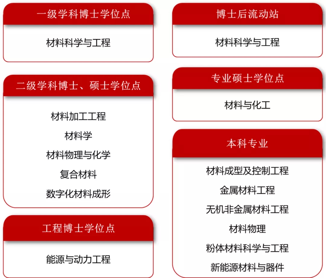 公司设有材料科学与工程一级学科博士学位点,一级学科博士后流动站,材料加工工程、材料学、材料物理与化学、复合材料、数字化材料成形5个二级学科博士学位(硕士学位)点,设有能源与动力工程博士学位点、材料与化工专业硕士学位点和6个本科专业。形成了“本科—硕士—博士—博士后”完整的高层次人才培养体系。