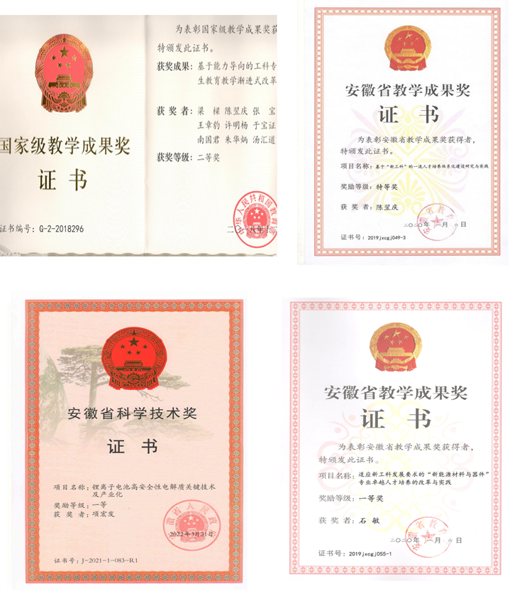 专业秉持教学科研有机融合,坚持教学-科研-应用之间的相互促进和高效衔接,建成安徽省智慧课堂课程1门,安徽省精品资源共享课程1门,省级线上线下混合式示范项目1门,逐步形成结构合理、人员稳定、教学水平高、教学效果好的教学团队,获得高等教育国家级教学成果奖二等奖1项(R2),安徽省教学成果奖特等奖4项(R1/R3/R3/R4),安徽省教学成果奖一等奖1项(R1),安徽省教学成果奖二等奖1项(R1);先后出版《纳米材料科学基础》(教育部高等公司规划教材)、《材料合成与制备技术》(高等公司十三五规划教材)等高水平教材。近三年员工在高水平创新创业竞赛中获得国家级特等奖、国家级一等奖等佳绩,以第一作者发表高水平学术论文并申请国家发明专利。